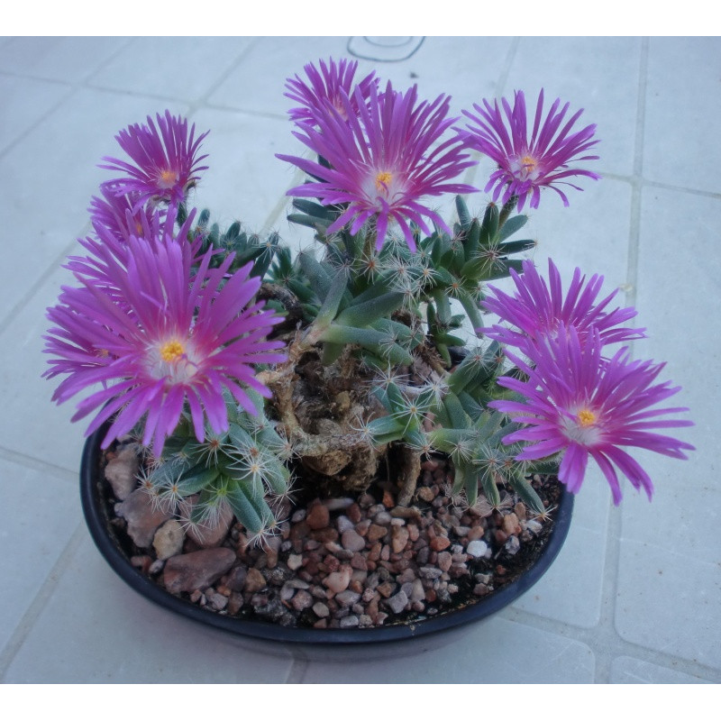Suchomilná, sukulentní rostlina s dužnatými trojbokými listy, které jsou 2cm dlouhé a zakončeny jemnými štětinkami. Růžovofialové květy o průměru 5cm. Bohatě kvetoucí od poloviny března do konce dubna. Vytváří ztlustlé kořeny a je velmi vhodná na tvorbu bonsai. Roste rychleji a má větší květy než ostatní druhy Trichodiadema. Pochází z Jižního Kapska v JAR. Expedujeme rostliny: Ø květináče 5,5cm.