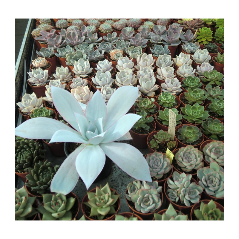 Echevérie, po okraji zvlněné šedozelené listy s růžovým okrajem. Robustní vzrůst, růžice může dosahovat až 25cm v průměru při pěstování ve větší nádobě. Zvonkovité růžové květy. Expedujeme rostliny: Ø květináče 6,5cm.