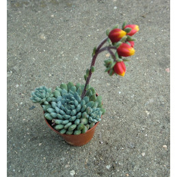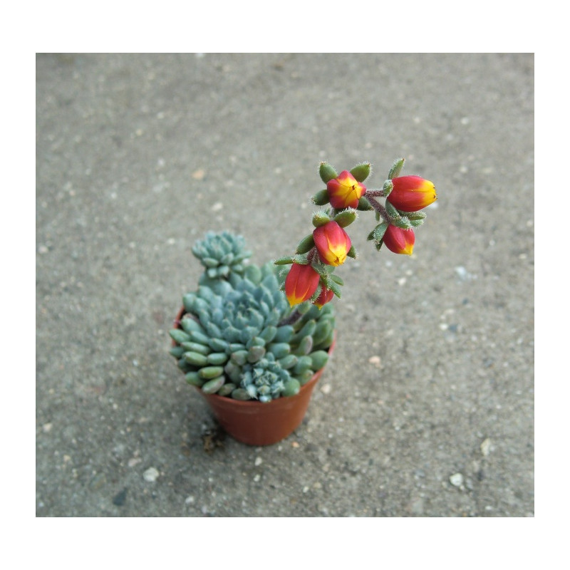 Špičaté listy jsou uspořádané do husté růžice. Zbarvení listů se liší podle intenzity slunečního záření od mátově zelené až po červené probarvení s šedavým nádechem. Červeno-oranžové květy na stvolu. Expedujeme rostliny: Ø květináče 5,5cm.