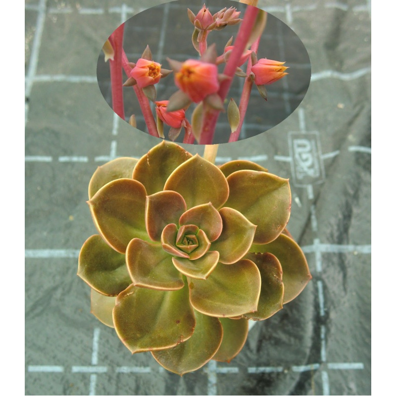 Tato atraktivní Echeverie vytváří nízké růžice modrých, drobných listů, které jsou pokryty štětinkami. Zvonkovité červené květy jsou uvnitř žluté. Expedujeme rostliny:  Ø rostliny 5+cm, květuschopné.
