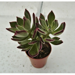 Echevérie, po okraji zvlněné šedozelené listy s růžovým okrajem. Robustní vzrůst, růžice může dosahovat až 25cm v průměru při pěstování ve větší nádobě. Zvonkovité růžové květy. Expedujeme rostliny: Ø květináče 6,5cm.