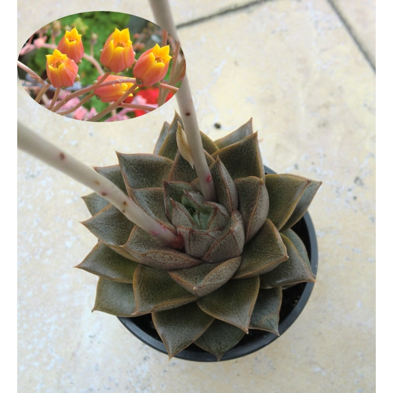 Tato atraktivní Echeverie vytváří nízké růžice modrých, drobných listů, které jsou pokryty štětinkami. Zvonkovité červené květy jsou uvnitř žluté. Expedujeme rostliny:  Ø rostliny 5+cm, květuschopné.
