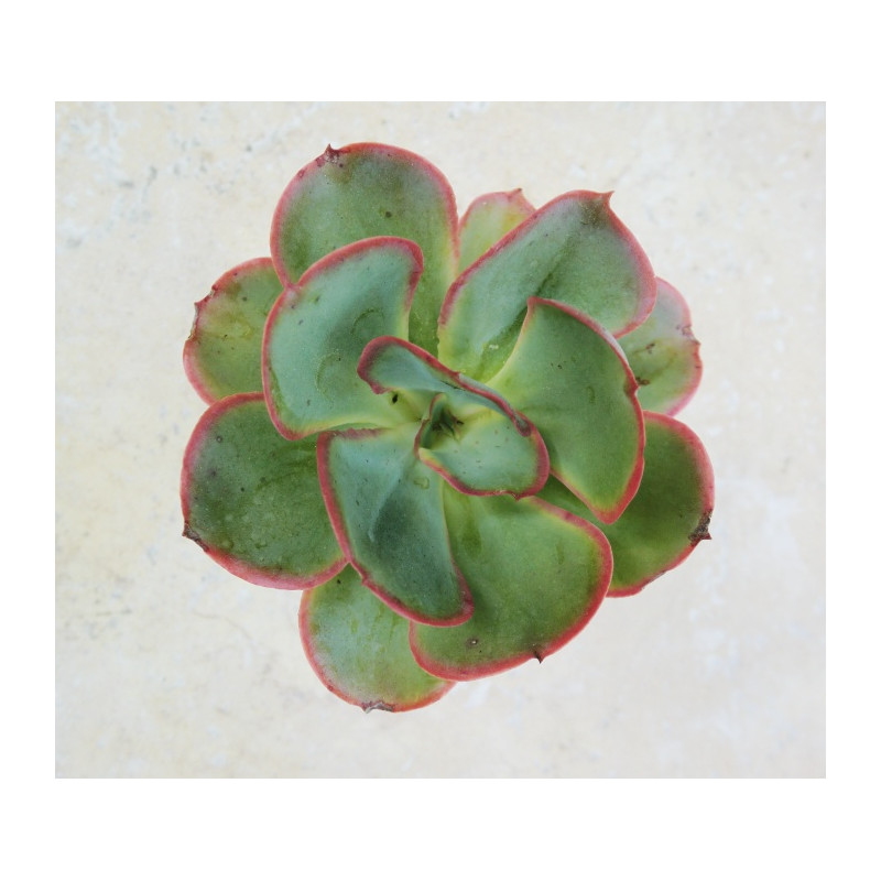 Echevérie, po okraji zvlněné šedozelené listy s růžovým okrajem. Robustní vzrůst, růžice může dosahovat až 25cm v průměru při pěstování ve větší nádobě. Zvonkovité růžové květy. Expedujeme rostliny: Ø květináče 6,5cm.