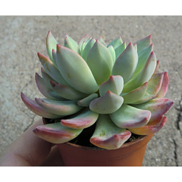 Drobná Echeverie s modrozelenými růžicemi ojíněných listů, které mají načervenalý nádech na okrajích. Zvonkovité, červeno-růžové květy jsou uvnitř žluté. Pochází z Mexika. Expedujeme rostliny: Ø květináče 5,5cm.