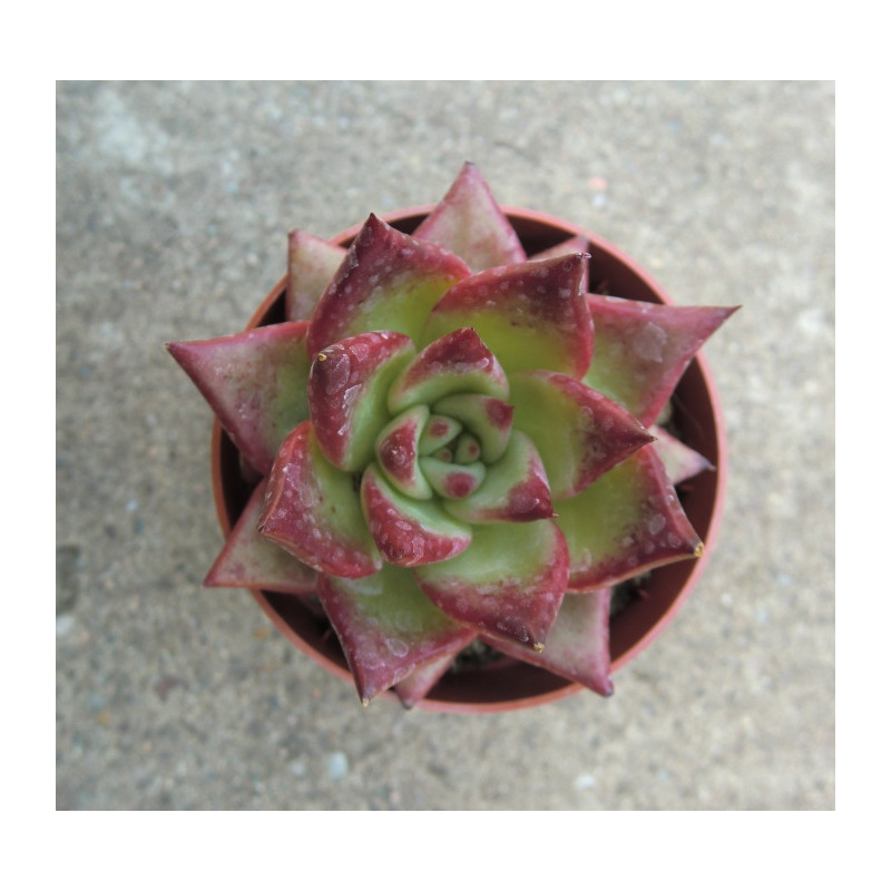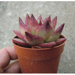 Echevérie, tvoří husté růžice o průměru až 5cm. Zelené listy jsou na okrajích červené. Na podzim se zbarvuje většina plochy listů do červena. Žlutooranžové, z vnější části červené květy. Expedujeme rostliny: Ø květináče 5,5cm.