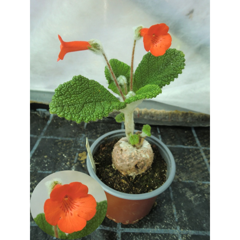 Suchomilná rostlina s hrbolatými, matně zelenými listy. Mladé listy jsou na spodní straně pokryty sněhobílými chlupy. Vytváří kulatou hlízu (kaudex). Trubkovité oranžovo červené květy 4- 5cm dlouhé. Na rozdíl od jiných hlíznatých Sinningií nemá tento druh přes zimu období klidu. Pochází z Brazílie. Expedujeme rostliny: Ø kaudexu / hlízy 3+cm.