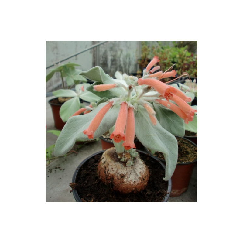 Méně známá suchomilná velmi dekorativní rostlina, šedobílé silně plstnaté listy připomínající samet, vytváří kulatý kaudex, trubkovité růžovočervené květy. Expedujeme rostliny: Ø kaudexu/hlízy 2,5+cm, květuschopné.