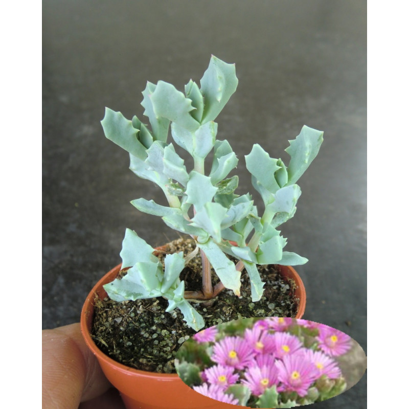 Bohatě větvený sukulentní keřík s šedomodrými trojhrannými listy a fialovými kvítky. Stonky se na plném slunci zbarvují do tmavě fialové barvy. Expedujeme rostliny: Ø květináče 5,5cm, keříček.