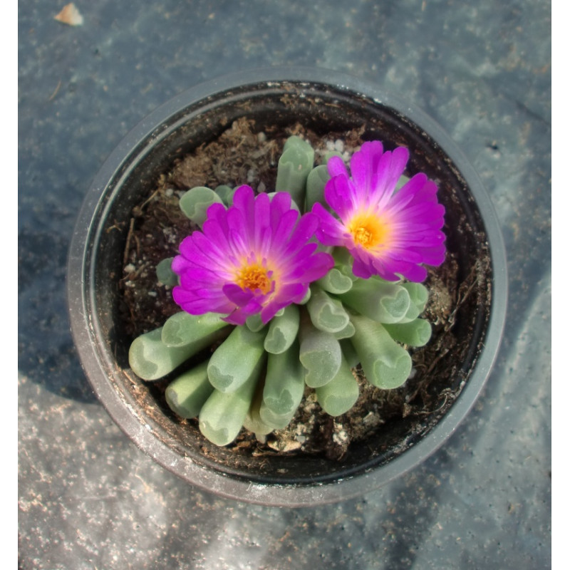 Trubkovité, na vrcholu zploštělé listy vytváří nízkou růžici. Purpurové květy s bílým nebo světle žlutým středem o průměru 2,5 - 3,5 cm. Je endemický v Jižní Africe. Expedujeme rostliny: Ø květináče 5,5cm.