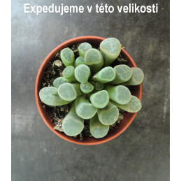 Sukulent s bíle ojíněnými listy, které jsou po okrajích zvlněné a červeně zbarvené. Zvonkovité květy na stvolu. Pochází z jižní Afriky. Expedujeme rostliny: Ø květináče 5,5cm.
