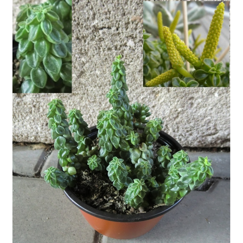 Vytváří stromeček s voskovitými drobnými,sytě zelenými listy, které jsou seskupené v malých hustých růžičkách. Na slunci se konce listů zbarvují do červena. Malé žluté květy. Vhodný na bonsai. Expedujeme rostliny: Ø květináče 5,5cm, rozvětvený keříček.