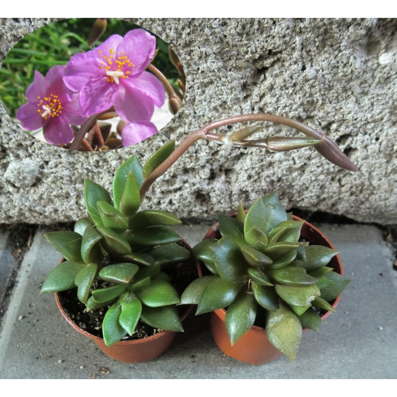 Vytváří spirálovité růžice listů. Velké, jasně růžové květy. Expedujeme rostliny: Ø květináče 5,5cm.