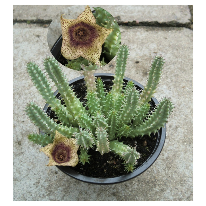 Vytváří silné 4-5 žeberné,stonky dorůstající do cca. 6cm. Květy jsou skvrnité s tmavým středem. Pochází z jižní Afriky. Expedujeme rostliny: Ø květináče 5,5cm.