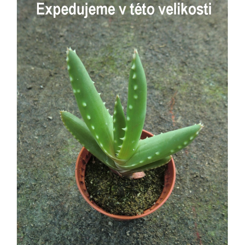 Malé Aloe se skvrnitými, po okrajích zubatými listy, které jsou na povrchu pokryty hrbolky. Oranžově žluté trubkovité květy.na krátkém stvolu. Expedujeme rostliny: Ø květináče 7cm.