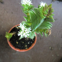 Vytváří stromeček s voskovitými drobnými,sytě zelenými listy, které jsou seskupené v malých hustých růžičkách. Na slunci se konce listů zbarvují do červena. Malé žluté květy. Vhodný na bonsai. Expedujeme rostliny: Ø květináče 5,5cm, rozvětvený keříček.