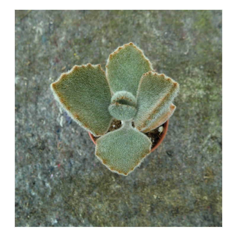 Sukulentní keř, který má po okrajích zvlněné trojúhelníkové listy pokryté měkkými hnědými chloupky, které dodávají listům krásný sametový vzhled. Malé nažloutlé květy Pochází z Madagaskaru. Expedujeme rostliny: Ø květináče 5,5cm.