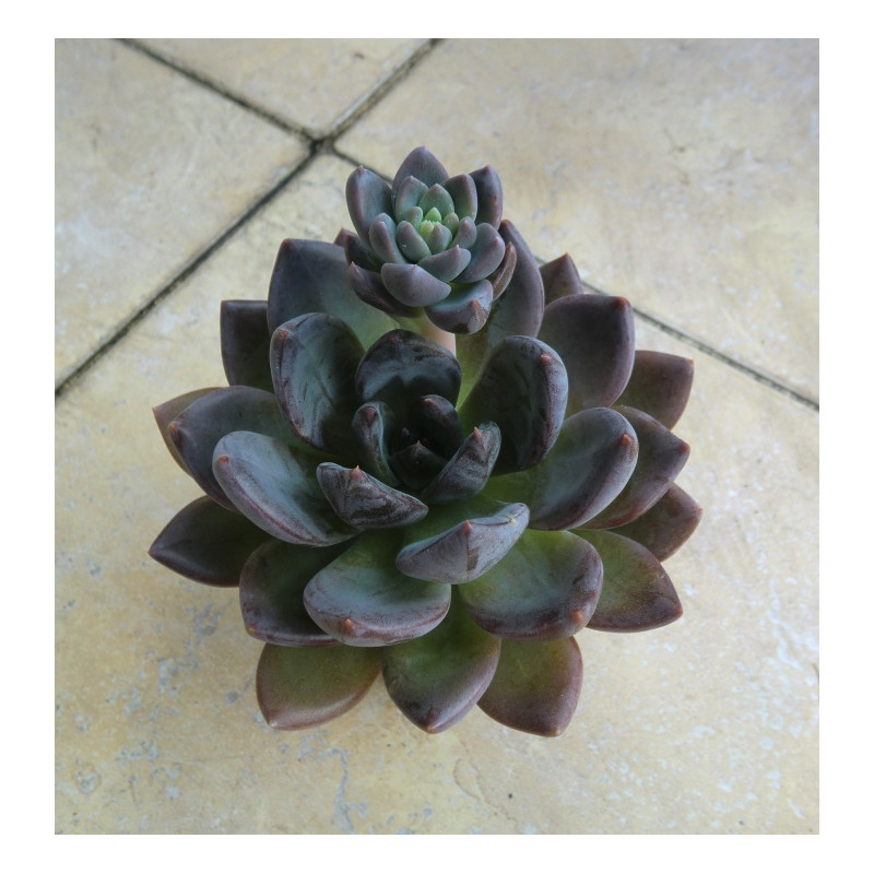 Kristátní forma této sukulentní rostliny je kříženec mezi Graptopetalum paraguayense a Echeveria gibbiflora. Dužnaté, ojíněné listy s voskovitým povlakem mají odstíny šedomodré, bronzové až fialové. Pochází z Mexika. Zbarvení je dáno v závislosti na ročním období a podmínkách růstu. Expedujeme rostliny: Ø květináče 6,5cm.
