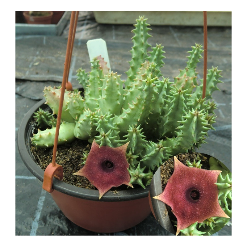 Rostlina tvoří vzpřímené, pětižeberné, zelené nebo modrozelené rozvětvené stonky. Hnědočervené květy o průměru 2cm. Patří mezi nejodolnější druhy, Pochází z Etiopie a Somálska. Expedujeme rostliny: Ø květináče 5,5cm.