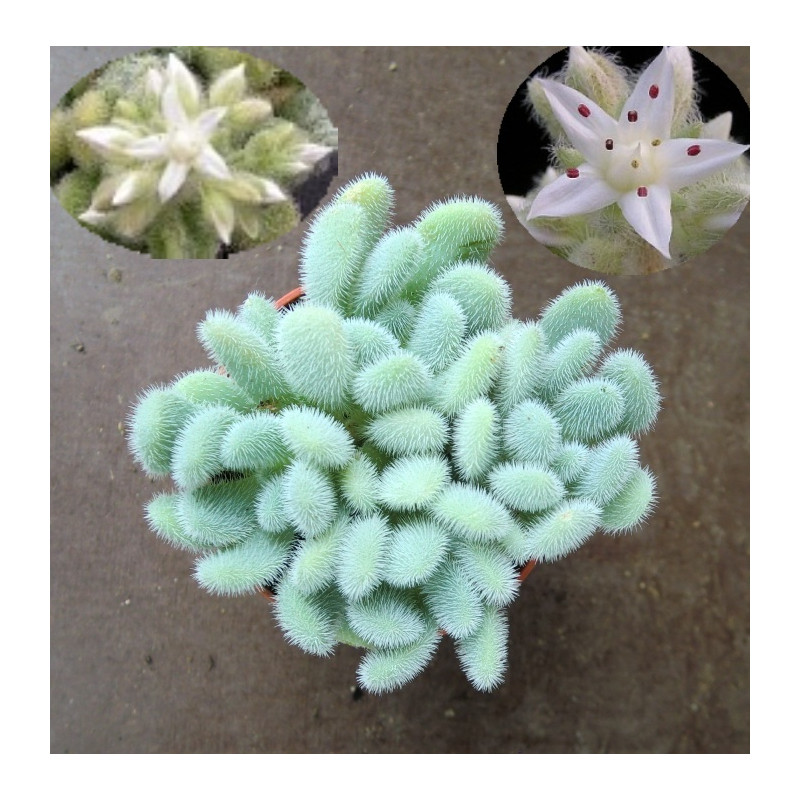 Rozchodník, tvoří růžičky modrozelených listů s jemnými chloupky na povrchu s kobercovitým růstem. Bílé květy na krátkých stvolech. Expedujeme rostliny: Ø květináče 5,5cm.