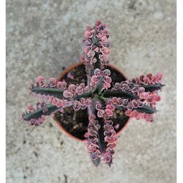 Kolopejka, kopinaté, dužnaté listy se skvrnami a voskovým povlakem. Po okrajích listů rostou drobné růžové rostlinky. Efektní a vzácný sukulent. Rostlina mění barvu v závislosti na slunečním záření. Expedujeme rostliny: Ø květináče 5,5cm.