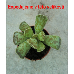 Tvoří keříčky se zploštělými a silně dužnatými listy, které jsou pokryty bílými chloupky. Zubaté výrůstky na konci listů. Tato atraktivní panašovaná forma má světle žlutý nádech buď na celých listech nebo části listů. Načervenalé trubkovité květy na štíhlém stonku. Vzácný kultivar. Expedujeme rostliny: Ø květináče 5,5cm.