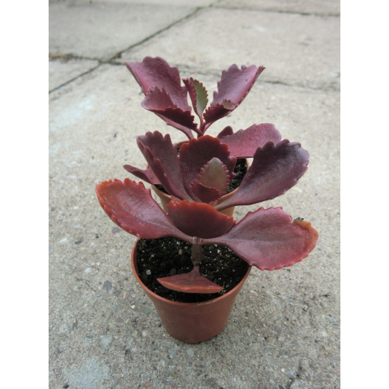 Tuhé po okrajích zubaté, lesklé listy přechází ze zelené do rubínových odstínů na slunci. Nažloutlé květy v rozvětveném květenství. Expedujeme rostliny: Ø květináče 5,5cm.