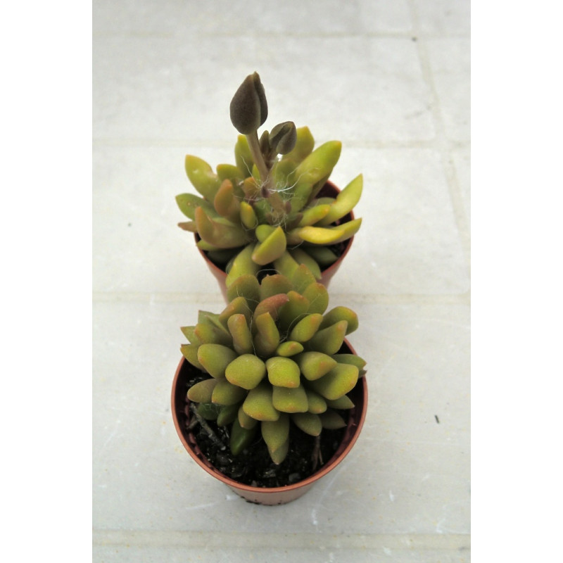 Tvoří keříčky se zploštělými a silně dužnatými listy, které jsou pokryty bílými chloupky. Zubaté výrůstky na konci listů se na slunci zbarvují do hněda. Krémově žluté- oranžové zvonkovité květy. Expedujeme rostliny: Ø květináče 5,5cm.