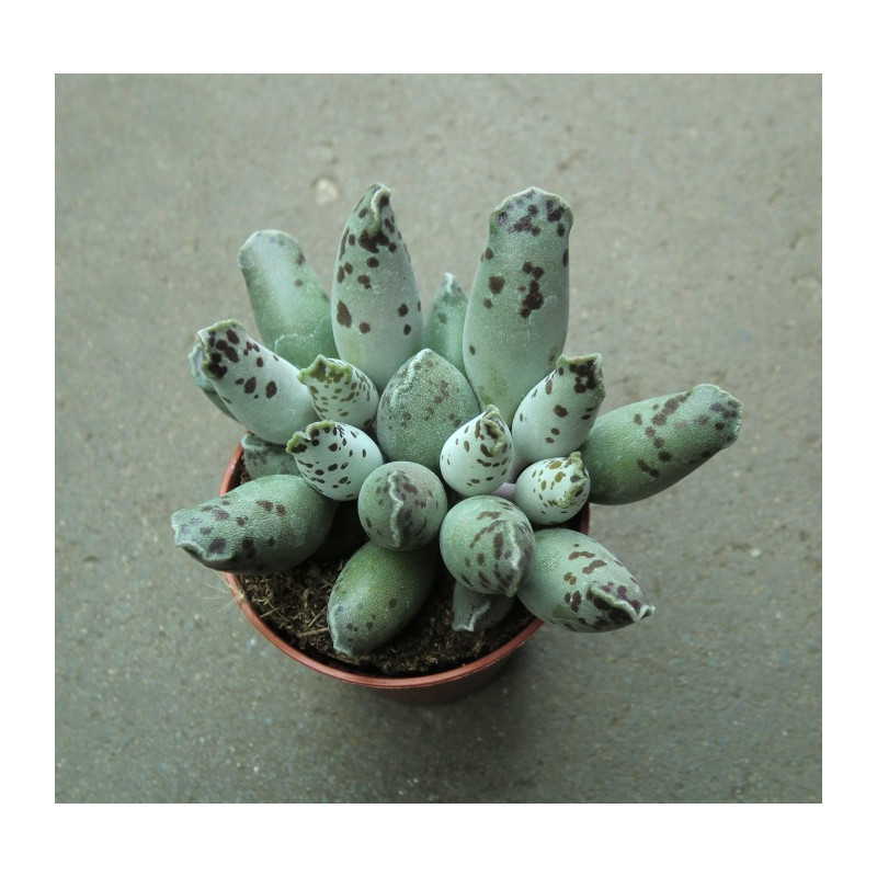 Africký sukulent tvořící trsy válcovitých, ojíněných listů, které jsou na koncích zvlněné s červenohnědou kresbou na povrchu. Drobné bílé-narůžovělé květy na stvolu. Expedujeme rostliny: Ø květináče 5,5cm.