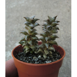 Vzácnější a pomalu sloupovitě rostoucí kříženec dosahuje výšky okolo 15cm. Tělo se skládá z trojúhelníkovitých listů. Kvete drobnými kvítky bílé nebo slabě narůžovělé barvy. Expedujeme rostliny: Výška rostliny 5cm.