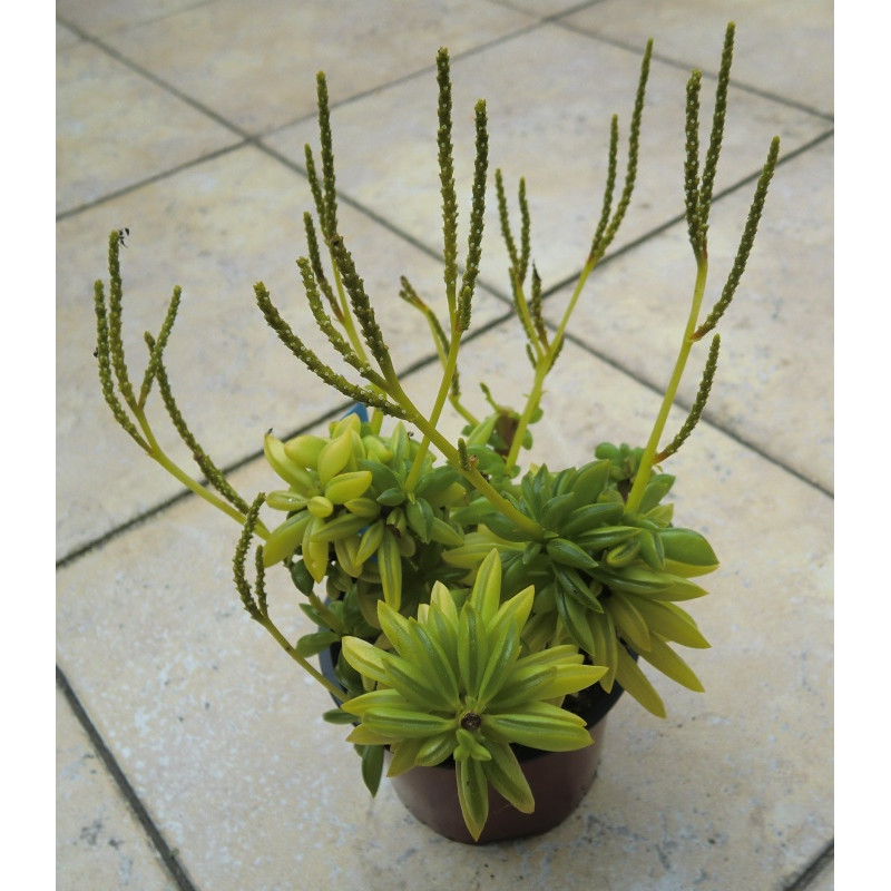 Růžičky tvořené drobnými lístky jsou lesklé, olivově zelené. Na slunci se zbarvují do měděné- červené. Žluté, hvězdicovité malé květy. Expedujeme rostliny: Ø květináče 5,5cm, keříček.