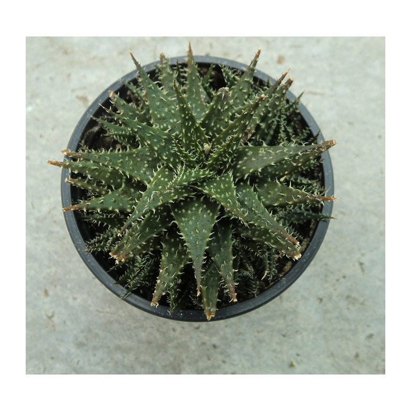 Miniaturní americký hybrid. Kříženec Aloe descoingsii x haworthioides. Tvoří nízké růžice o průměru 5cm. Trojúhelníkové, tmavě zelené listy s bílými znaky jsou zakončené měkkými, stříbřitými štětinkami. Expedujeme rostliny: Ø květináče 5,5cm.