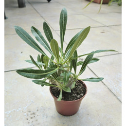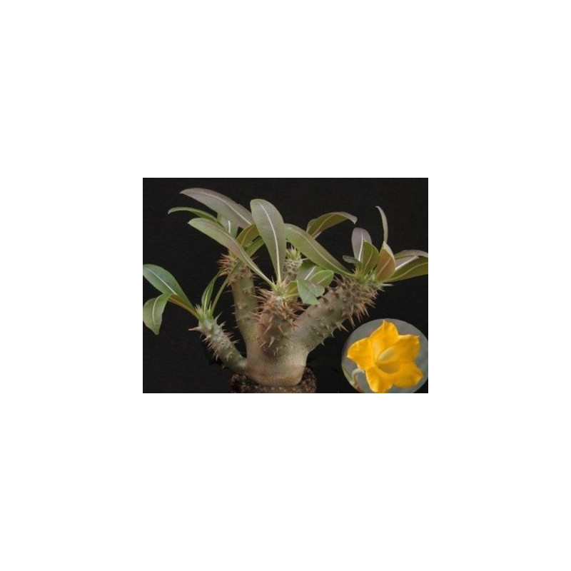 Zakrslý sukulentní keř z Madagaskaru se žlutými trubkovitými květy. Vytváří ztlustlý kmínek s ostnatými rozvětvenými výhony a oválnými leskle zelenými listy, které jsou na spodní straně stříbřité. Kaudiciformní sukulent. Expedujeme rostliny: Výška 4+cm. Ø kmínku 1+cm.